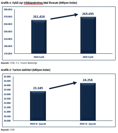 Türkiye, 2025 yılı Eylül ayında 22,6 milyar dolarlık ihracatla tarihinin en yüksek Eylül ayı performansını yakaladı. Turizm gelirleri 24,3 milyar dolara ulaşırken, yıl başında belirlenen 390 milyar dolarlık mal ve hizmet ihracatı hedefi de tamamlandı.